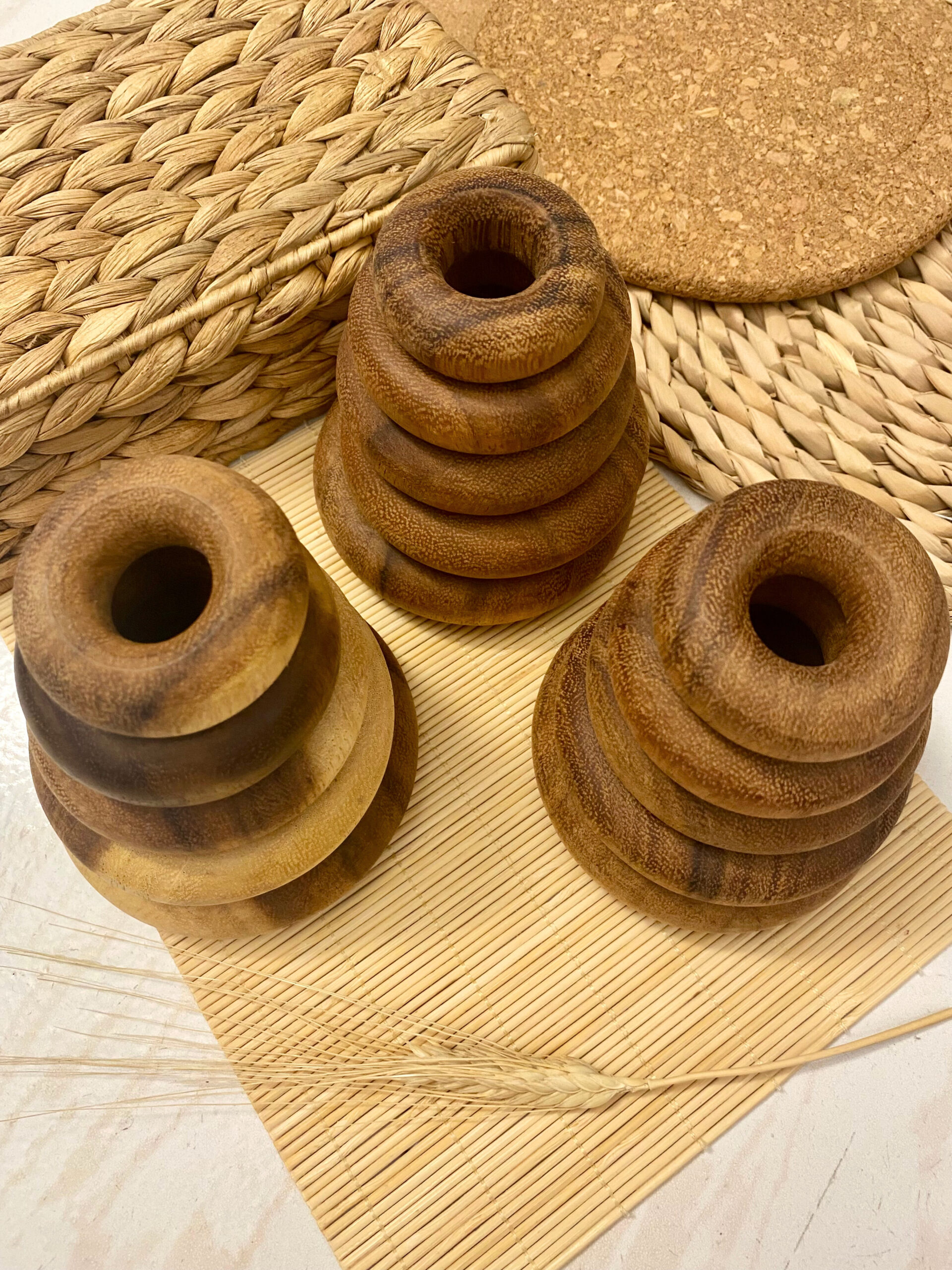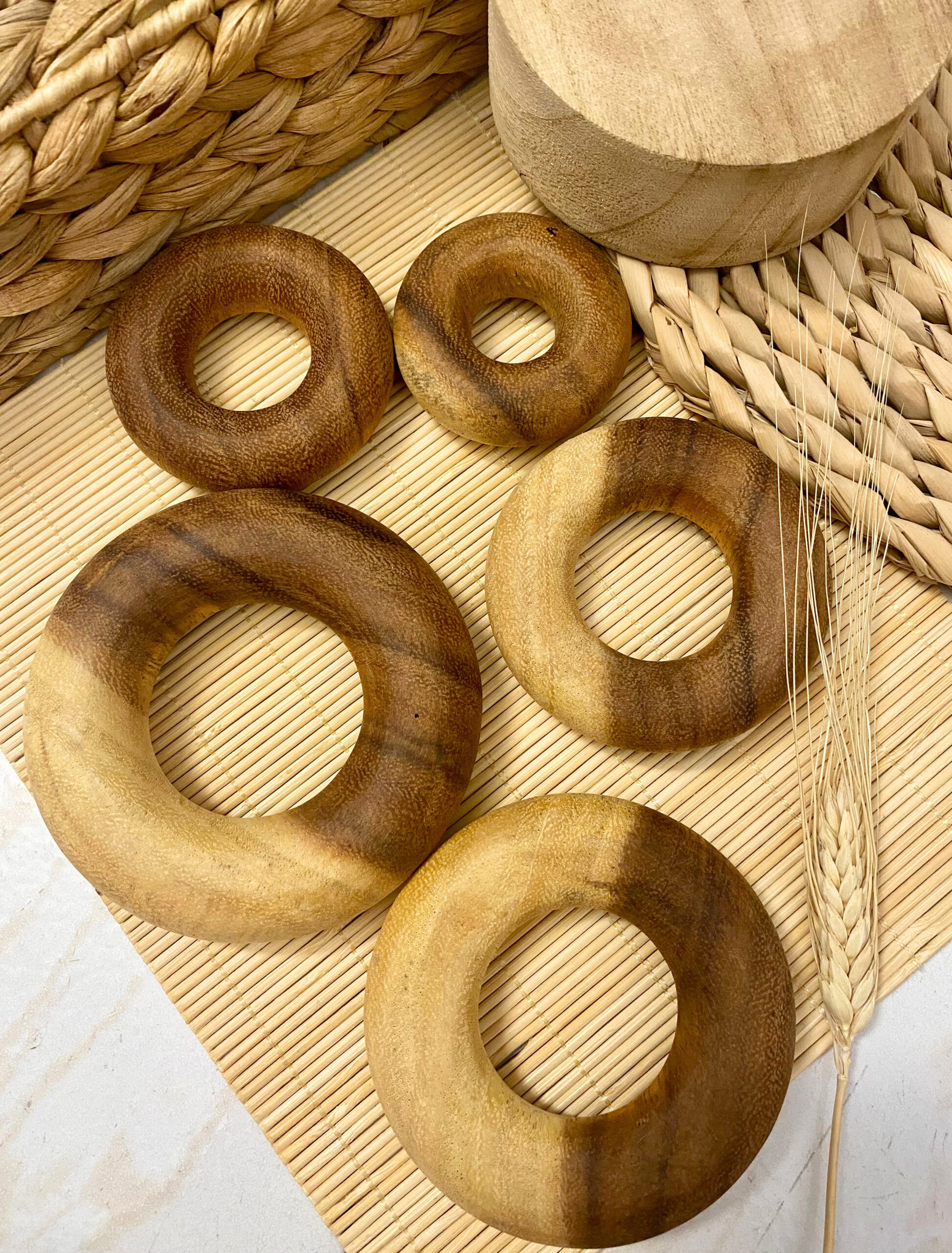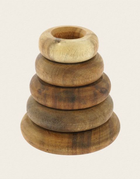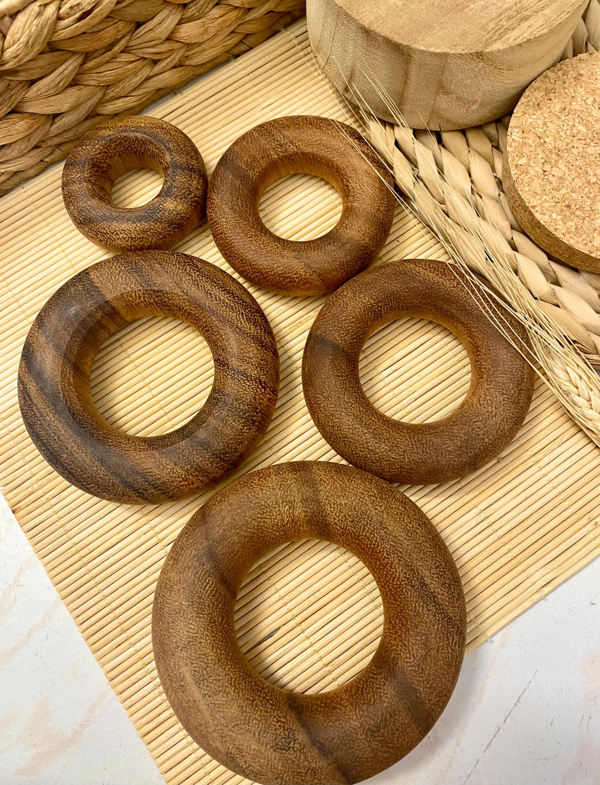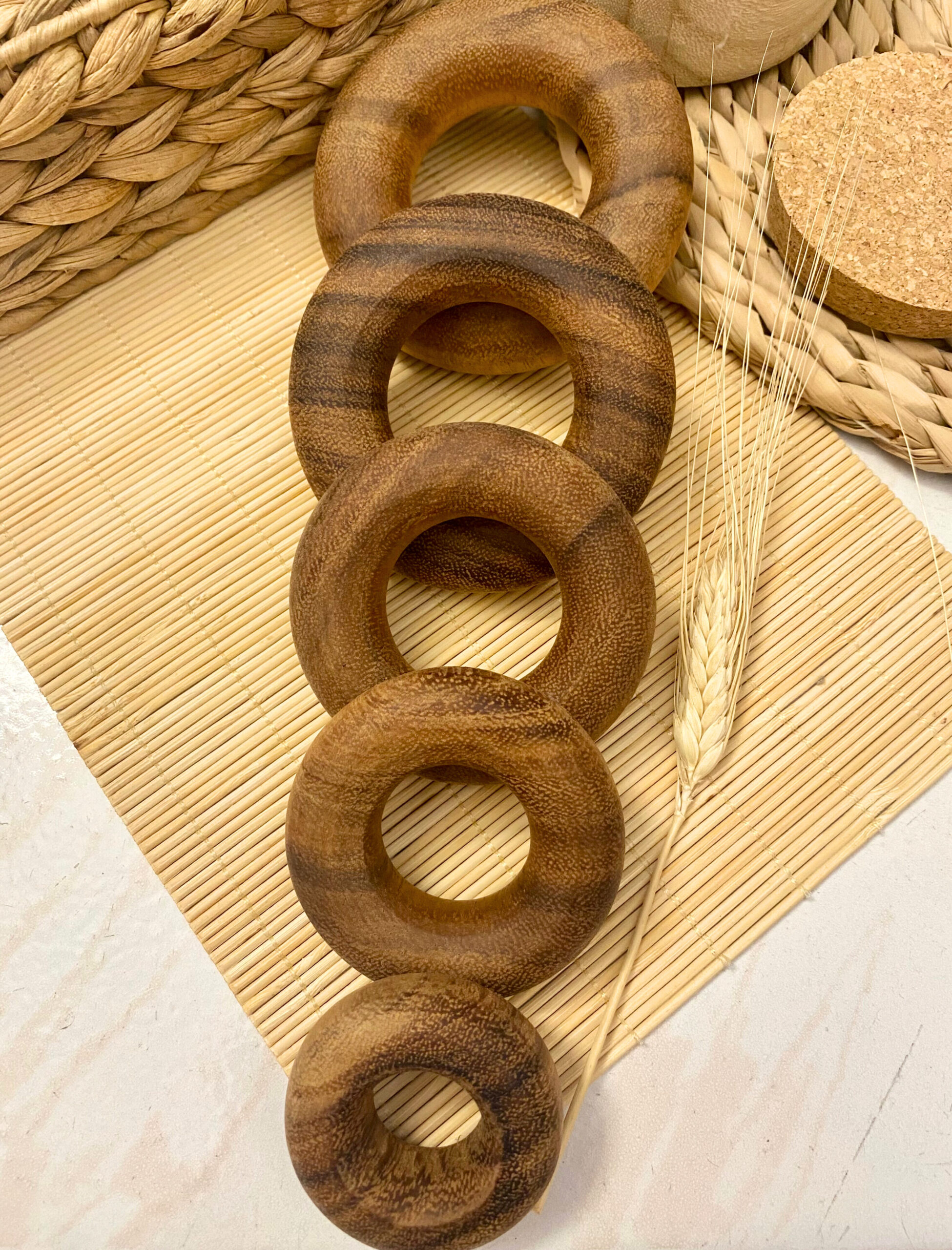 Cada una de las anillas está tallada y pulida cuidadosamente a mano para garantizar un tacto cálido y agradable; y conserva las vetas y tonalidades propias de la madera, convirtiéndolo en un material sensorial, único y natural.