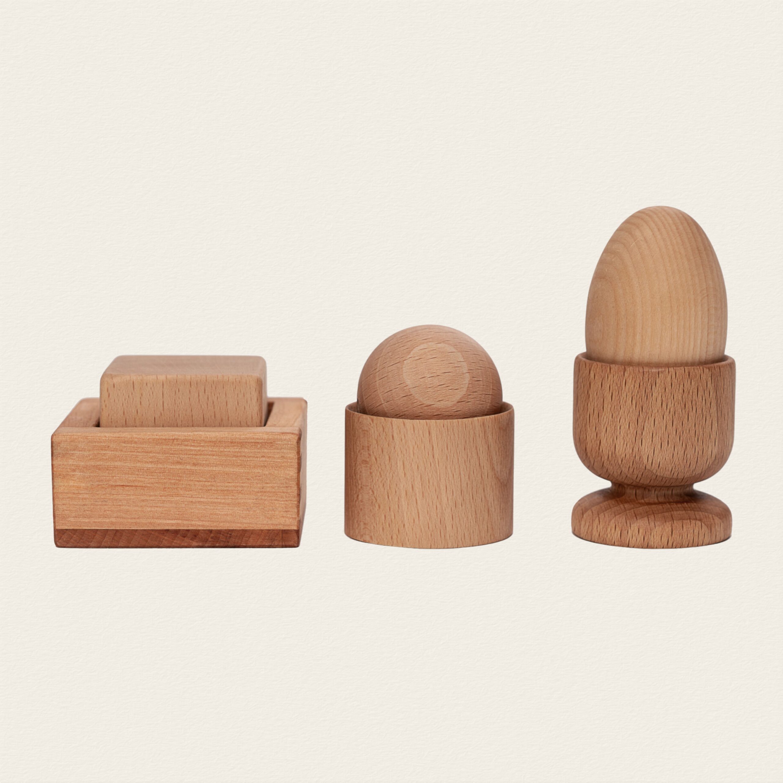 Este conjunto sencillo, lleno de posibilidades y formado por 6 piezas, invita al bebé a explorar las diferencias de formas, medidas y proporciones, estableciendo las primeras relaciones entre estos conceptos. También permite comparar, unir y realizar las primeras construcciones, colocando cada pieza sobre su base correspondiente: el huevo sobre la copa, la esfera sobre el cubilete y el cubo sobre la base cuadrada.